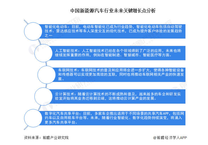 除此以外,前瞻产业研究院认为,中国新能源汽车行业未来的关键增长点还包括智能化电动车、人工智能技术、车联网技术、云计算技术、数字化汽车共享平台。这些领域的发展将会带来巨大的市场机会和潜力。